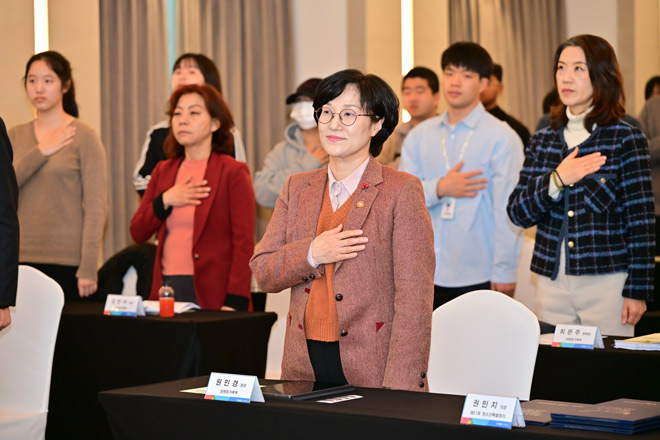 원민경 성평등가족부 장관이 13일(토) 오후 서울 피스앤파크 컨벤션에서 열린 제21회 청소년특별회의 결과보고회 및 참여활동 우수사례 시상식에서 국민의례를 하고 있다.