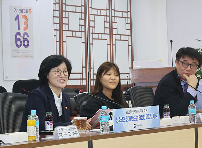 원민경 성평등가족부 장관이 6일(금) 오후 정부서울청사에서 열린 '안전한 디지털환경 조성을 위한 간담회'에 참석해 청소년보호위원회 및 청소년특별위원회 위원들과 청소년 AI 이용, SNS 과의존 등에 대해 논의하고 있다. |