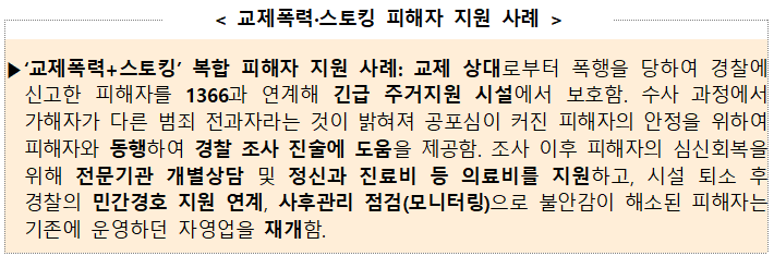 긴급 주거지원, 치료회복 프로그램 등 교제폭력·스토킹 피해자 위한 맞춤형 사업 추진 - 5일(수), 교제폭력·스토킹 피해자 보호·지원 사업 운영기관 현장 방문 - 지난해 긴급 주거지원 272명, 치료회복 프로그램 356명 지원 김기남 여성가족부 기획조정실장은 5일(수) 오후 서울xhzld 소재 교제폭력·스토킹 피해자 지원 사업 운영기관을 방문합니다.